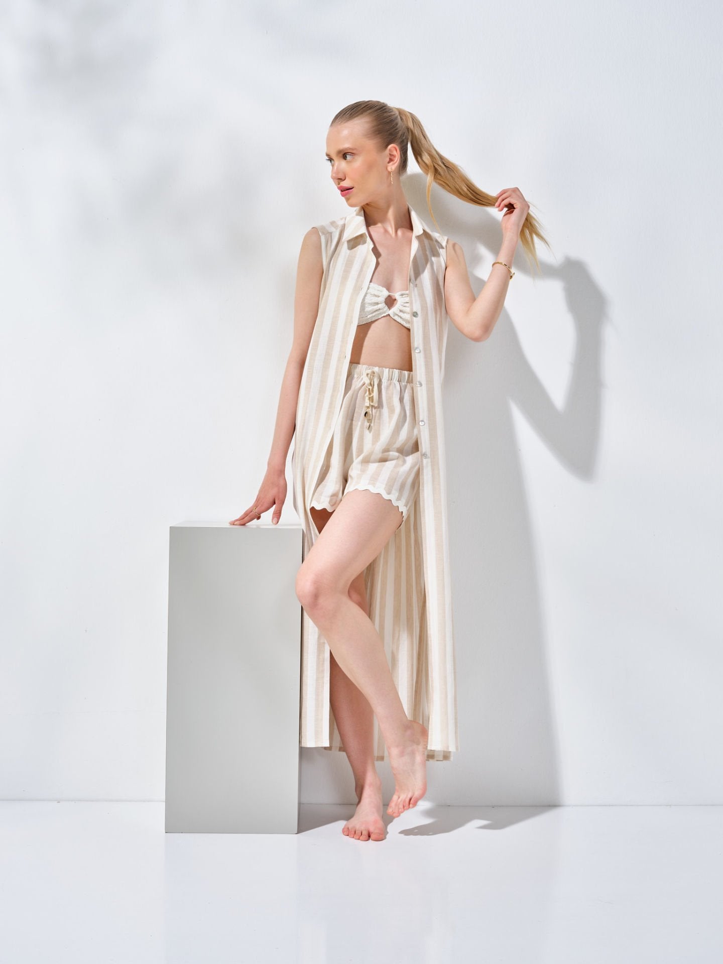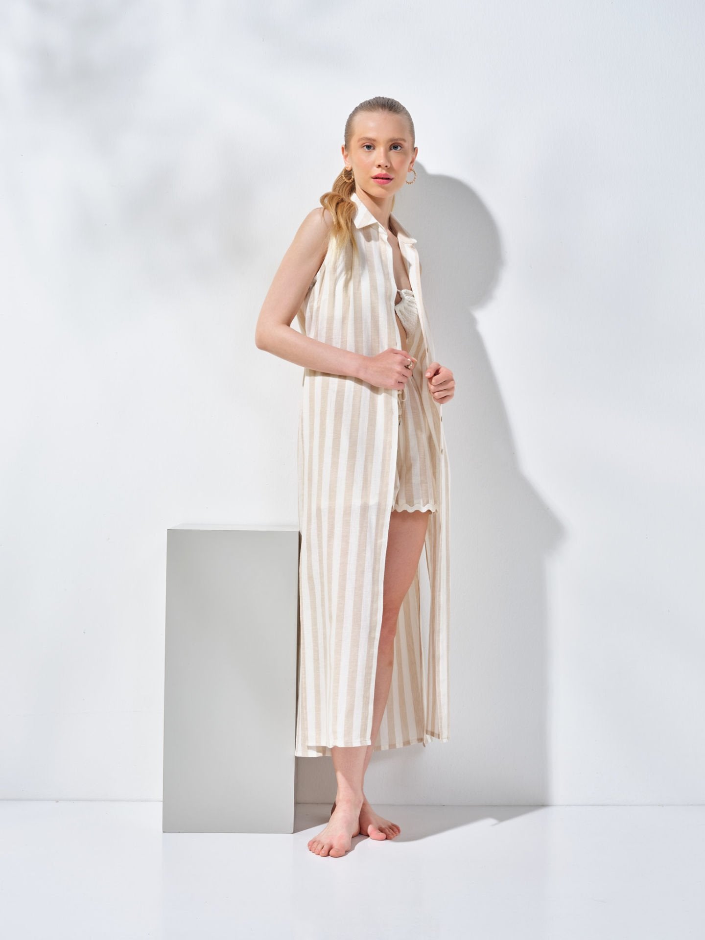 Uzun Kolsuz Gömlek Elbise Bej Krem Çizgili
